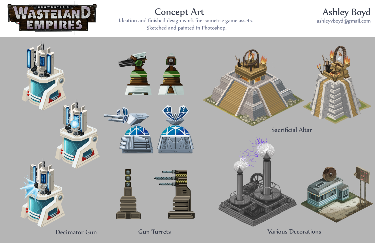Crowdstar’s Wasteland Empires was a post-apocalyptic real-time strategy social game on Facebook. I worked on story illustrations and 3D concepts for in-game art assets.